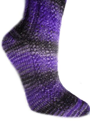 This is the January 2009 sock for the Politically Incorrect sock club. Columns of fascine rib make a tidy snug-fitting sock. The slip-stitch rib pattern breaks up any pooling with hand-dyed yarns.