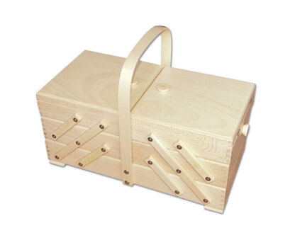 42 x 21 x 31cm. Made from beech wood, this large sewing box features a three-tier cantilever style storage system with two hinged lids. Well made with strong joints and quality materials, this sewing box is finished with a clear hard wearing varnish.
