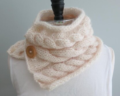 The Larisa cowl is a great accessory for those blustery winter days or slightly chilly temps. Fashioned with a trio of cables and puffy borders, this elegant cowl will give you the level of warmth you need. There is one center large button and button hole. The two side buttons are sized to push through the fabric without a button hole, allowing you to wear this cowl several different ways. Using #5 bulky yarn on U.S. Size 10 needles, this cowl is a quick knit and a great gift idea.