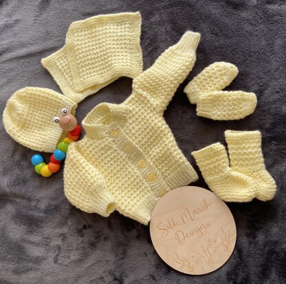 Our Lark pattern contains knitting instructions to make a baby outfit of cardigan, beanie hat, socks, mitts and bonding squares and features a 4-row repeating pattern.