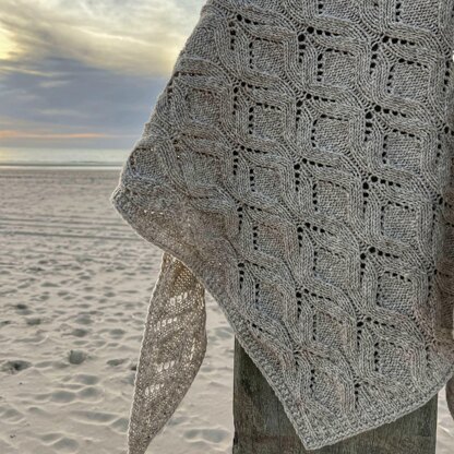 The inspiration for this shawl comes both from the Spanish landscape and from the Spanish wool used for the sample. Sand ripples on the beach suggested the name of ‘Las Playas,’ which is triangular in shape and which, despite its cabled appearance, is actually an all-over lace pattern.