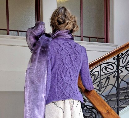 An intricate panel of rocking cables adorns the back of this elegantly tted jacket, hence each front and sleeve has a series of accompanying small cables. The body of the jacket is knitted at with hems, while the sleeves are worked in the round. The sample is worked in a beautiful heathered color in the bouncy Ask – Hifa 2.