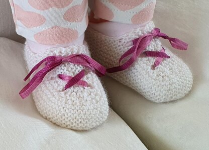 These easy knit, 3ply, garter stitch baby shoes or slippers have a ribbon tie. This style of shoe is also available in 4ply.