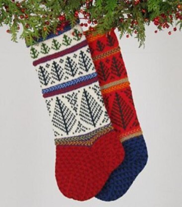 Pattern provides clear written instructions, along with color charts for each colorway, to knit a Chistmas stocking in the round.