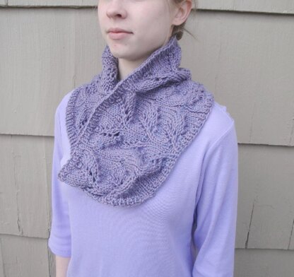 An elegant lace pattern mimics the delicate curve of the lavender flower in this cozy cowl.