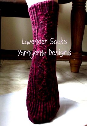 covered in Bavarian Twisted stitches, these socks look like they have been carved out of wool in lovely green and lavender colours