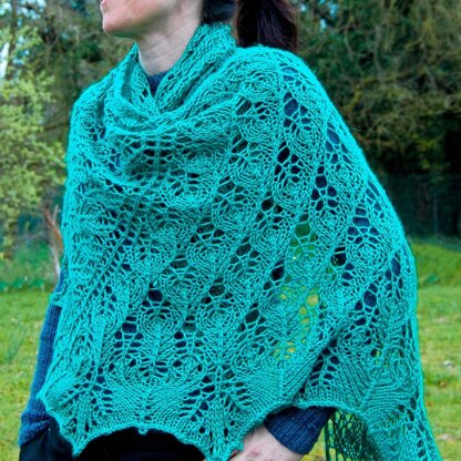 Lavish Land; inspired by the ripe promise of season in full leaf, this shawl is sumptuously rich and luxurious. The fabric is given lush drape by triple plying; a technique which simultaneously maintains a shimmering airiness to your fabric. Yet all this splendour is achieved by working with one ball of yarn at time (instructions provided on how to achieve this trick), and stitch patterns that are simple and intuitive and knit up at speed