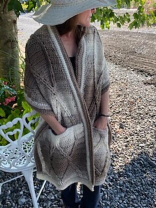 Lazy Cables Pocket Shawl is an instant classic style with a crossing cable design and generous pockets.