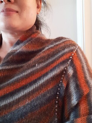 • The whole shawl is worked in stockinette stitch with garter st on the outside edges. • There are 3 garter st edges on both outside edges of this shawl. • Beads are added to the “Stems” of the shawl at each end and also to the “Center Spine” of the “Leaf”. • There are 5 sections to complete this shawl. • variegated color yarn best shows this pattern.