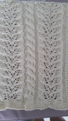Alternating twin leaf pattern and an 8 stitch basic cable, on a background of reverse stocking stitch makes this an eyecatching blanket.