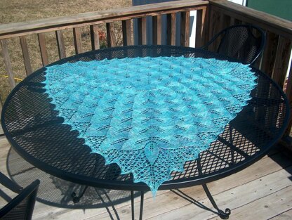 The featured sample measures 45” between corner tips and requires one, 700 yard skein of “Lavish Lace” from BBKnits.com in Illumination; 50% Merino/50% Silk.