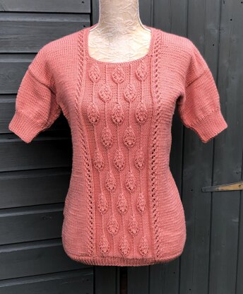 This pretty top features a central panel on the front, with alternating leaf motifs set on single rib "stalks", framed by delicate slanting eyelets. The back echoes the design with a simpler panel of single ribs edged with the eyelets. The short sleeves can be easily lengthened to suit your style. All pieces worked from the bottom up, and with full written instructions.
