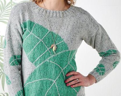 This is a pattern for a leaf intarsia jumper, originally published in Simply Knitting. It has two large scale leaves on the front and back, smaller ones on the sleeves, and embroidery on the motifs. 2 x 2 rib edges. The sleeve chart is hand done as this is the only way to show the shaping. Photos Simply Knitting.
