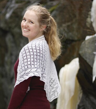 White shawl used 1 skein Jaggerspun Zephyr Wool-Silk 2/18 in White [50% merino, 50% silk; 630yd/ 576 m per 57g] on 3.5mm (US 4) needles. Blocked size: 125 x 71 cm (49 x 28 inches). Gauge: 19 stitches = 10 cm in stockinette.