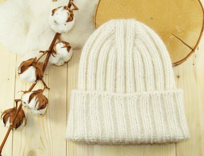 ● a beanie with a folded brim ● worked in the round from brim to crown ● ribbed pattern ● integrated flat shaping