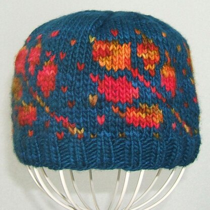 Lovely hat to keep a chill away. Flying leaves of reds, oranges, greens on a background of deep teal blue. The colorwork is stranded and not too difficult, with directions given for working from the chart and details on how to catch your floats.
