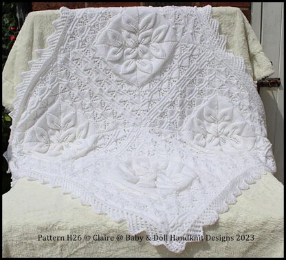Knitting pattern to make a stunning leaf motif shawl. It is knitted in 16 triangles, and edged with a lovely lattice and chains stitch border.
