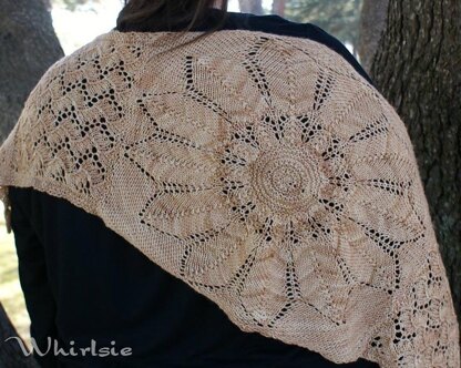 This scarf pattern uses various stitches to depict the story of Leaving Kansas. In the centre is a sunflower motif, the state flower of Kansas. This motif is initially knit in the round, then short rows are used to turn the centre panel into a square.