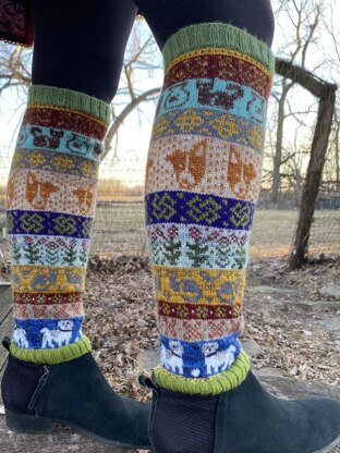These stranded legwarmers place cats and dogs upon your legs to keep you warm, along with some Celtic knots and flowering plants. Designed to use up leftover bits of sock yarns, the pair of shaped legwarmers used less than 25g/110yds of each color. Due to the large stitch count of the animal band repeats, only one size is offered. For smaller legwarmers, use smaller needles for a tighter gauge. For larger legwarmers, consider using heavier weight yarn and/or larger needles.This pattern was rated intermediate by test knitters.