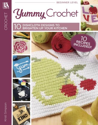 Leisure Arts eBook Yummy Crochet- Leisure Arts Yummy Crochet Book- Who doesn’t love a beautiful project with a yummy meal to complement it? This book walks you through how to replicate 10 dishcloth designs and 10 accompanying themed recipes. Crochet yourself and your family some tasty memories. Projects designs include bees, fruit, barns, chickens, pigs and more. Recipes include: beefy gumbo, honey mustard, cheesy chicken pasta, sparkling lemonade and more. Comes with step-by-step instructions, diagrams and color charts to make each project a breeze. Requires: US size 4 medium weight yarn and a size G-6, 4 millimeter, hook. Beginner skill level. Finished towel sizes measure approximately 10 1/2"x 10 1/2". 48 pages, PDF download.