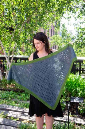 Leitmotif is a large, drapey triangle shawl featuring an all-over double eyelet diamond pattern. The center portion of the shawl is worked flat from the bottom up, with the border knitted on and worked in the round to finish.