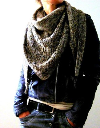 Lemmy K. is a triangular shawl worked flat from the top down. A plain Stockinette stitch body followed by a wide cable/lace band and the sportive 2x2 Rib at the edge makes it a versatile companion for everyday.