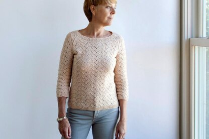 Here’s Lena! – a versatile all-season pullover, super terrific wardrobe addition, AND very fun knit! Lena’s fit is slim and shapely, extending high hip in length. Her neckline is a wide shallow scoop that enhances the drama of her raglan three-quarter sleeves, all trimmed up in a 1x1 rib. Double Wing lace is Lena’s overall texture – an easily memorized 16 stitch by 10 row repeat. Its reverse stockinette, re-employed at the edges, allows (minimal) seaming to be worked comfortably and oh so invisibly! Lena is worked bottom-up on circular needles until the underarm and start of raglan shaping where the bodice splits and each side is worked separately. The neckline trim is continued from stitches held with just a bit of pick up along each side front. REQUIRED TECHNIQUES: knit, purl, yo, k2tog, ssk, sl1-k2tog-psso, m1r, m1l, p2tog, p2tog tbl, long-tail CO method, stitch pick for neckline trim, blocking, and seaming.