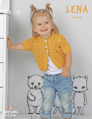 Lena is a simple lace cardigan worked from a chart with a 6 row patt repeat. Any DK weight yarn can be used. Pattern is written for sizes 0-11 years.