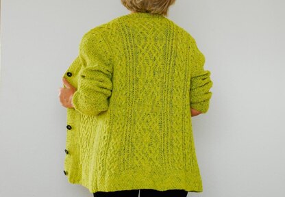 This cardigan is intended to fit with about 5 - 6” [13 - 15 cm] of positive ease at bust. Shown in size M with 6” [15 cm] positive ease at bust.
