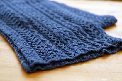 Although it contains multiple cable and lace combinations, this project is suitable for the brave intermediate / beginner who has some knowledge of cabling. A simple 8 row repeat that is easily remembered after a few repetitions makes this scarf possible to work without constantly having to reference the pattern. Lack of border stitches creates a simple yet elegant wave down the length and ends of the scarf.