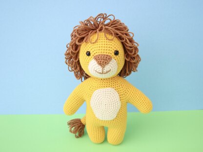 Using the materials suggested this lion measures 28cm (11in) tall. Any yarn can be used with this pattern with an appropriate size crochet hook to create a tight tension, although other yarns may affect the size of the finished lion. Suggested materials: DK (8ply) 60% cotton, 40% acrylic yarn, 3mm crochet hook, toy stuffing and 9mm safety eyes.
