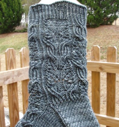 This is a lace sock that can be knit from the toe up or from the cuff down, with a slip stitch heel. There are 2 sizes, Small (64 stitch leg), and Medium (70 stitch leg). There is an option to do the toe in an eye of partridge stitch.