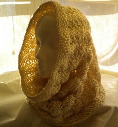 Lexi knitted cowl /hood. This delicate chevron-lace pattern is lovely made with a soft yarn. Wear it as a cowl or a hood. Worked in the round. One Size Fits Most. 25" circum x 17" long. (to make larger, increase to desired length). Skill Level: Easy. Yarn Weight: Medium Worsted. Knitting Needles: US 8