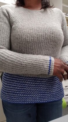 Material Yarn weight: Fine 2, or any that gives the needed gauge Woolike Yarn by Loops & Threads Color A (grey) 4 to 5 skeins (2700 to 3300 yards) Color B (blue) 1 skein 3.5 mm hook & 4.5 mm hook