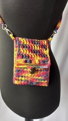 A simple, quick project: a cross-body bag in which to carry your mobile phone. The bag has a flap with instructions for a choice of fastenings: ties to make a bow fastening, or a loop for a button fastening. The bag is made in one long rectangle, starting at the flap edge, and folded, so it is easy to make the bag longer than the one I’ve made. The sides are crocheted together, and loops made to take the strap. The strap is a crocheted Romanian cord on the larger hook, with swivel lobster clasps attached at each end. I used an indie dk yarn/light worsted yarn, but any similar dk yarn will work. The pattern is a 2 stitch repeat, so it can be easily adjusted to be wider than the one I’ve made. The pattern is written in English and uses UK terms.