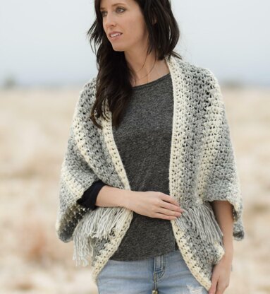 This medium weight, blanket sweater shrug is perfect to take off the chill and add some style to your wardrobe. The self-striping Lion Brand Scarfie yarn creates gorgeous soft stripes with an eye catching and unique colorway. The stitch used is a crossed half double crochet which creates a “knit like” look in certain sections of the shrug. The construction is very simple as it’s made by crocheting a rectangle that is then seamed at the arms. This blanket sweater is both comfortable and functional for colder months. Attach fringe for a trendy look, or leave the blanket sweater fringe-free to show off the clean, modern striping.