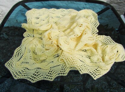 This baby blanket is knitted in a Lighted Torches lace pattern with Lion Brand Pound of Love soft Aran weight yarn, with a pretty lace border.