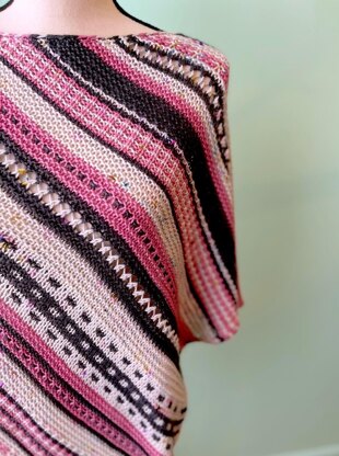 Inspired by film reels and the transition from Black and White film to technicolor, these slipped stitches and slip-zags are the perfect textured accents for this generously sized shawl that measures 35" by 42."