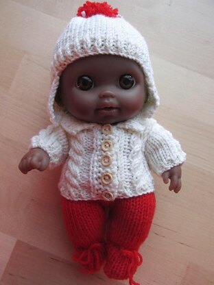 Knit this cute outfit for your Li'l Cutesies doll. Instructions are for cabled jacket with collar and cables on front, back and sleeves, (note that the pattern has four buttons on the jacket and not five as in the photos), leggings with ties at the ankles and pull on hat with earflaps and pom pom.