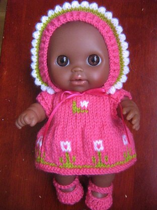 Knitting pattern for outfit to fit a Berenguer Li'l Cutesies doll. There are instructions for dress, bonnet, shoes and panties. The pattern uses 3mm needles and lightweight DK yarn. One 50g ball of main colour will make the whole outfit with small amounts of the contrast colours.