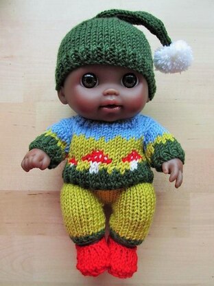 Really cute outfit for your Li'l Cutesies doll comprising picture sweater with toadstool design, pixie hat, trousers and shoes. The outfit is knitted with straight 3mm needles and fine DK yarn.