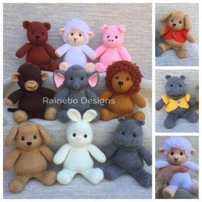 These Lil’ Hugkins are knit in the round, using Magic Loop or double pointed needles. The legs, body, “arms” and head are all knit on as you go along. The jacket is removable. They sit approx. 6” tall (without ears) and are created using #3-light wt. (DK wt.) yarn. These Lil’ Hugkins are perfect friends for little hands and make darling craft table items! Bunny, Hippo, Puppy, Bear, Piggy:85 yds, Lion:85 yds(mc)/50 yds(cc), Monkey:65 yds(mc)/30 yds(cc), Elephant:85 yds(mc)/10 yds(cc), Lamb:95 yds(mc)/40 yds(cc)
