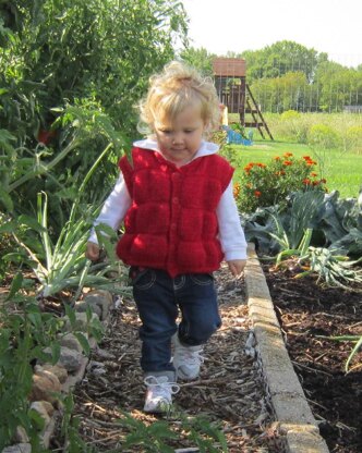 This adorable vest closely resembles a down-filled ski vest and is nearly as warm. The faux quilting is incredibly simple to accomplish, and with the bulky gauge, this knits up in no time at all.