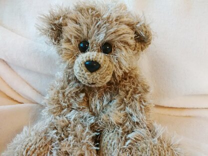 This is Lil' Bear who sits at just 6 inches/16cm. He is knitted using eyelash/furry yarn, knitted on straight needles, flat, sewn up and assembled.