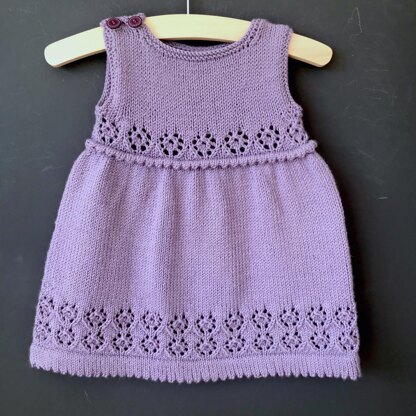 This garment is knit seamlessly from the bottom up, featuring a picot hem and an easy lace pattern. The skirt is worked in the round to the underarms, a picot welt is worked, then the front and the back are worked flat. The left shoulder is formed using a three-needle-bind off, the right shoulder is fastened with buttons. Stitches are picked up at the neckline and armholes to create the edging.