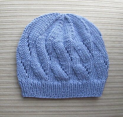This cute hat is made in a very attractive lace stitch that is easy and quick to knit. The pattern includes both written instructions and a chart for the stitch. The hat is made in the round and does not have a seam.