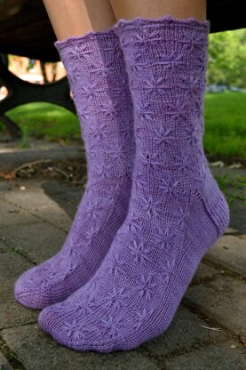 Inspired by the dainty lilac flower and starting with a scalloped edge, these socks are knit from the cuff down and embellished with flowers created by using wrapped and slipped stitches. The stitch pattern is given in both written and chart form.