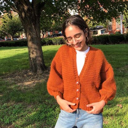 A bulky weight cardigan with lace detailing on the back with the option for embroidery.