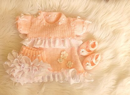 This is a very simple knit for people new to using knit in lace. I used the lace with broderie anglaise attached and added ribbon and flowers. Personally I think this is suitable for a beginner as the stitch is straight forward knit and purl and it is the lace that really brings it to life. Pictures do not do this design justice and you can really make it your own with whatever embellishments you add.