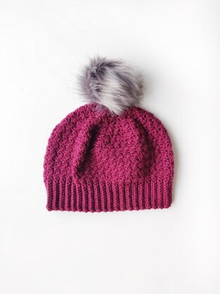 A textured lemon peel stitch beanie worked from the bottom up, with a length of ribbing followed by working in round rows. Soft and light in aran/worsted weight yarn, with a form fit style for an adult female size. Also part of a set with coordinating scarf and fingerless gloves.